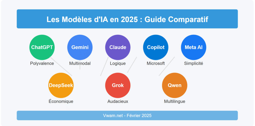 26 février 2025 – Les assistants IA sont partout : ChatGPT, Gemini, Claude, Copilot, Meta AI, DeepSeek, Grok, Qwen… Avec autant d’options, difficile de s’y retrouver ! Que vous soyez un créatif, un codeur ou juste curieux, cet article décortique ces géants de l’intelligence artificielle pour vous aider à trouver votre match parfait. Prêt à plonger dans ce comparatif brûlant ? Allons-y !